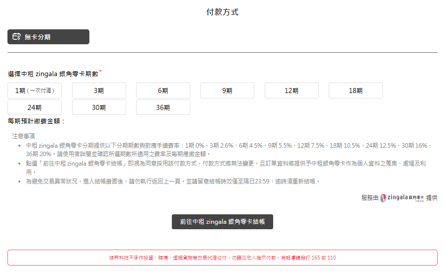 - 付款方式設定為BNPL時,依廠商後台>系統設定>無卡分期切換設定,決定付款畫面顯示「裕富無卡分期」或「中租銀角零卡」