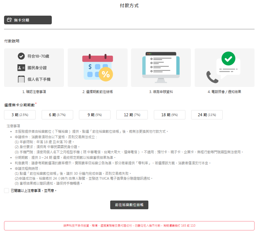 - 裕富無卡分期:金額不可小於1000元或大於30萬元