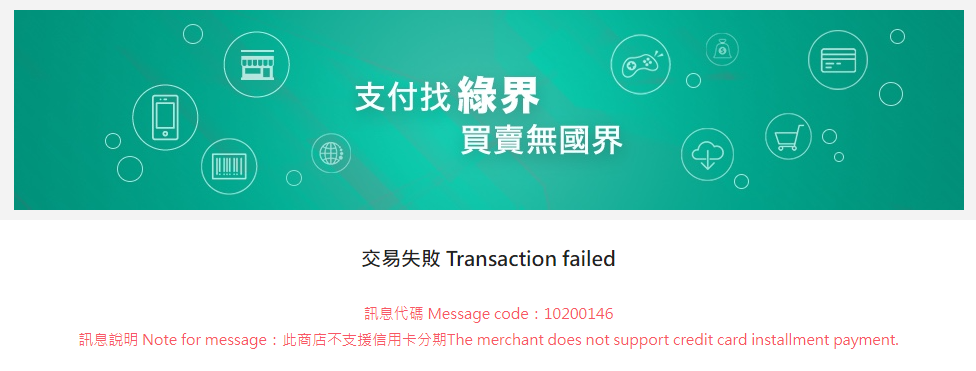 錯誤代碼:10200146 此商店不支援信用卡分期