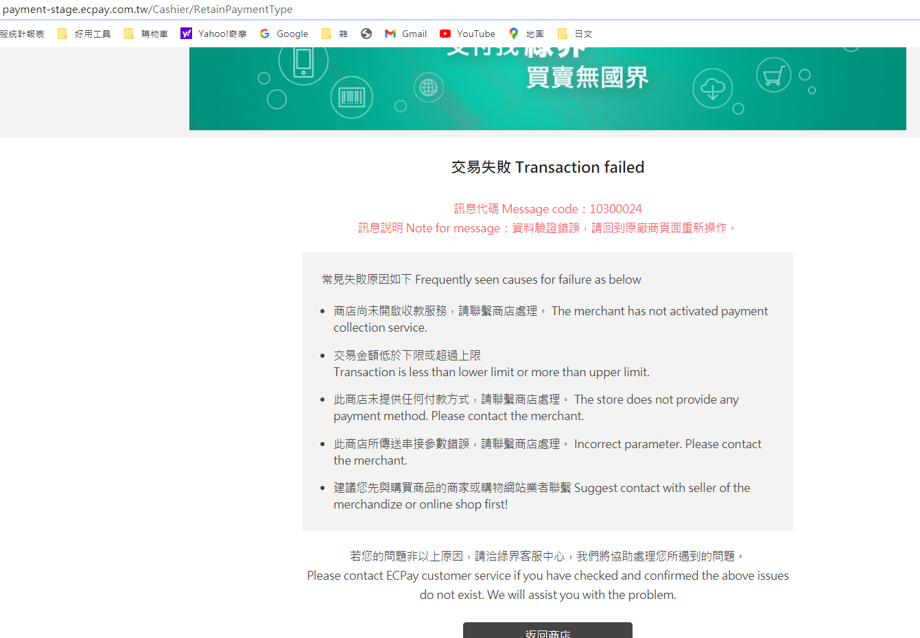 常見的交易失敗錯誤代碼:10300024『資料驗證錯誤,請回到原廠商頁面重新操作。』