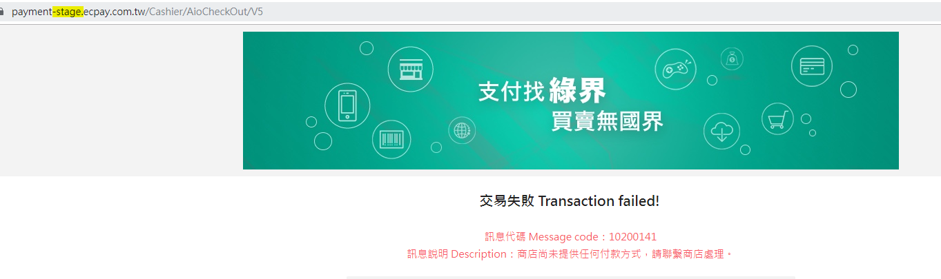 若為正式環境 API網址為https://payment.ecpay.com.tw/Cashier/AioCheckOut/V5 出現此錯誤訊息則表示未完成金流服務申請,需與客服中心聯繫