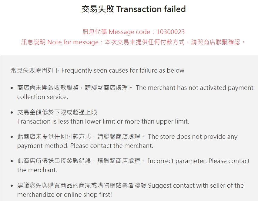 錯誤代碼:10300023 本次交易未提供任何付款方式