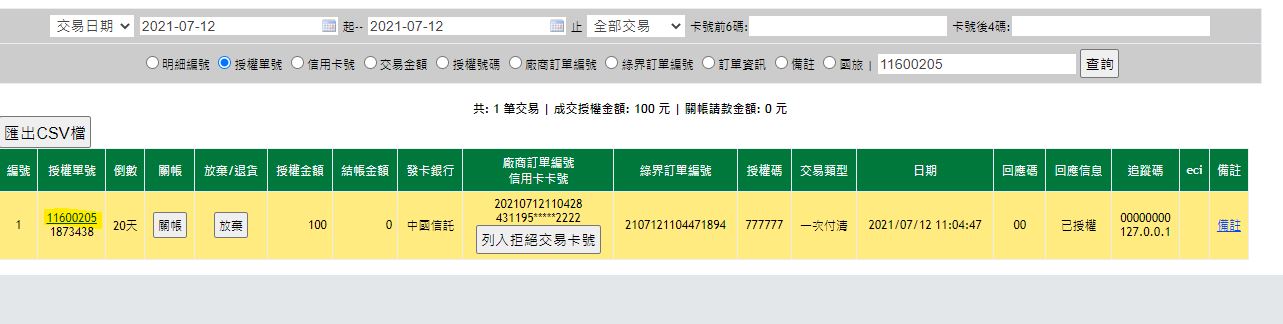 頁面路徑:廠商管理後台(可點擊另開)→信用卡收單→交易明細查詢