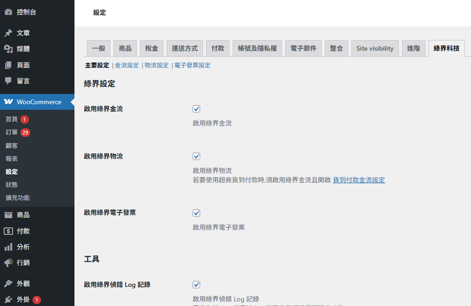 購物車後台->WooCommerce->設定(Settings),點選綠界科技分頁。