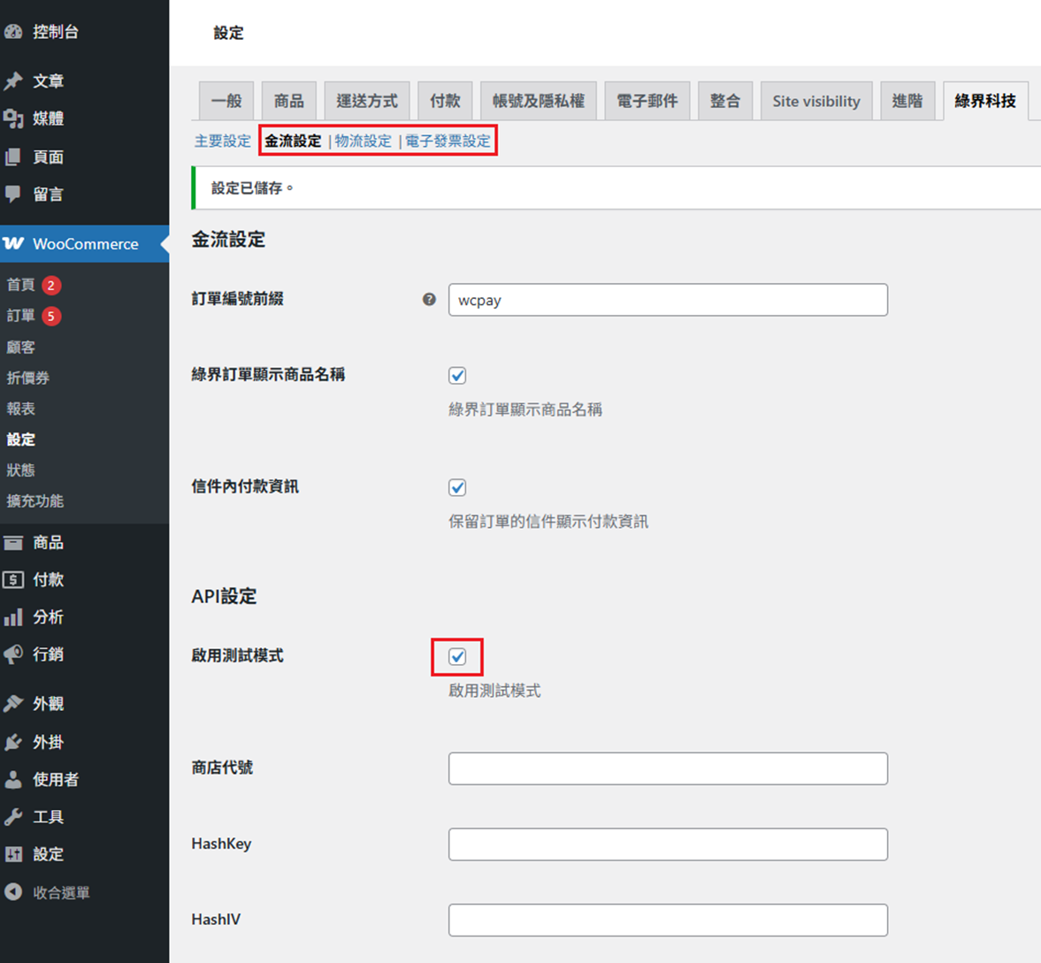 - 若要為金流、物流、電子發票啟用測試模式,只要「起用測試模式」打勾即可。若要啟用正式模式,取消打勾,並於「商店代號」、”HashKey”、 “HashIV” 輸入正確資料。