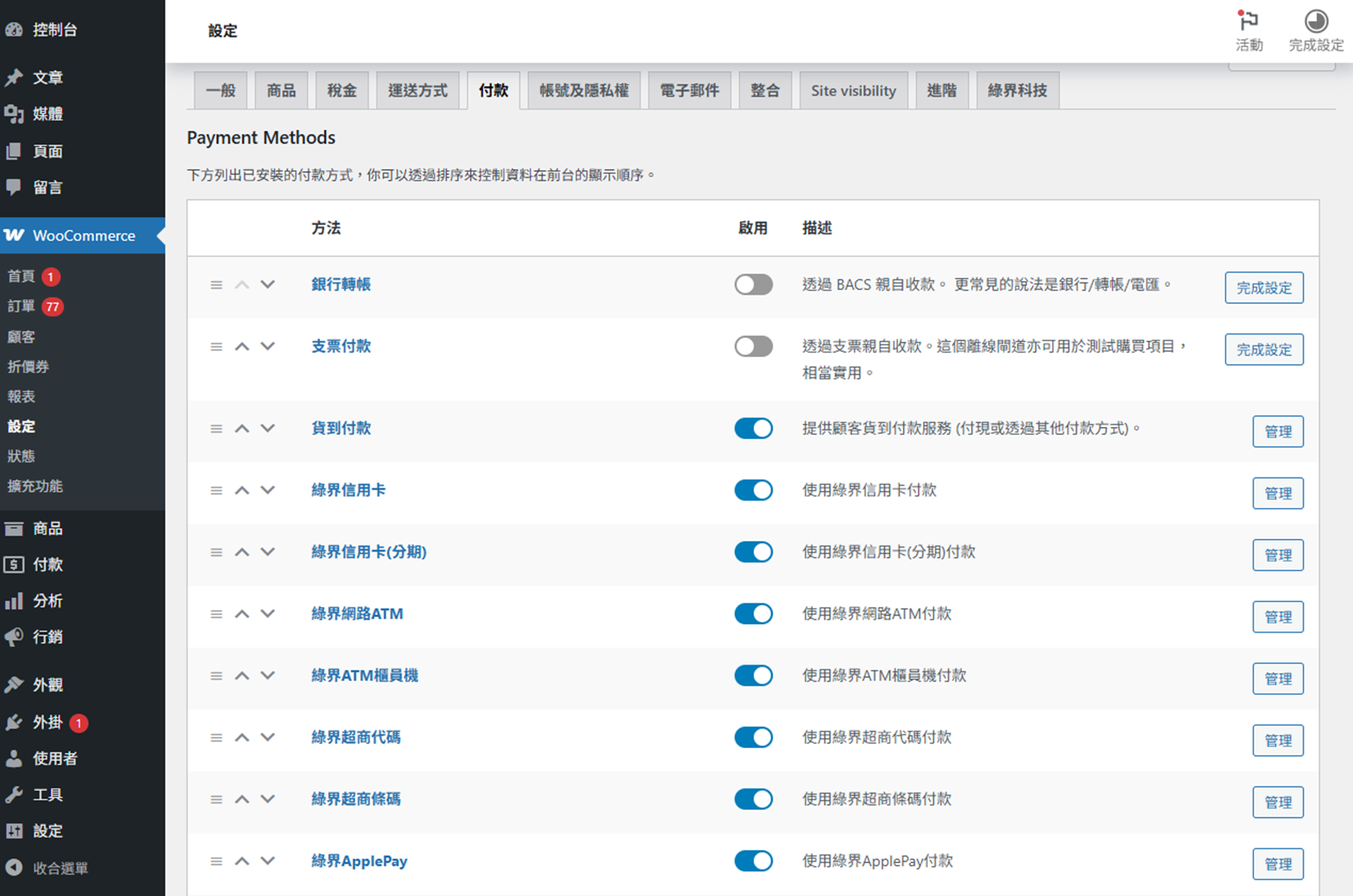 若因網站需求需要安裝其他模組,因安裝許多其他模組可能因模組衝突而影響正常運作,剛開始使用時,請先僅安裝 ECPay Ecommerce for WooCommerce 即可,確認運作正常後,再逐一安裝其他模組,並觀察狀況。