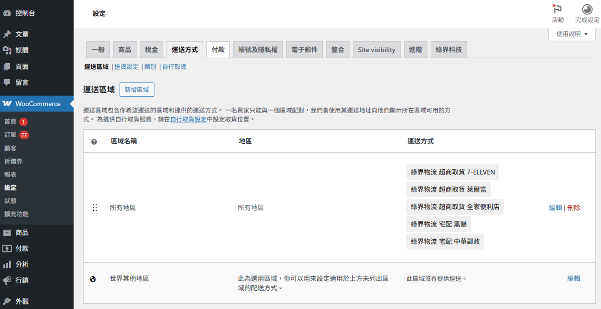運送方式->運送區域->編輯->新增運送方式,加入要提供的綠界物流種類,並可進入個別物流種類中編輯運費、免運以及啟用門檻。