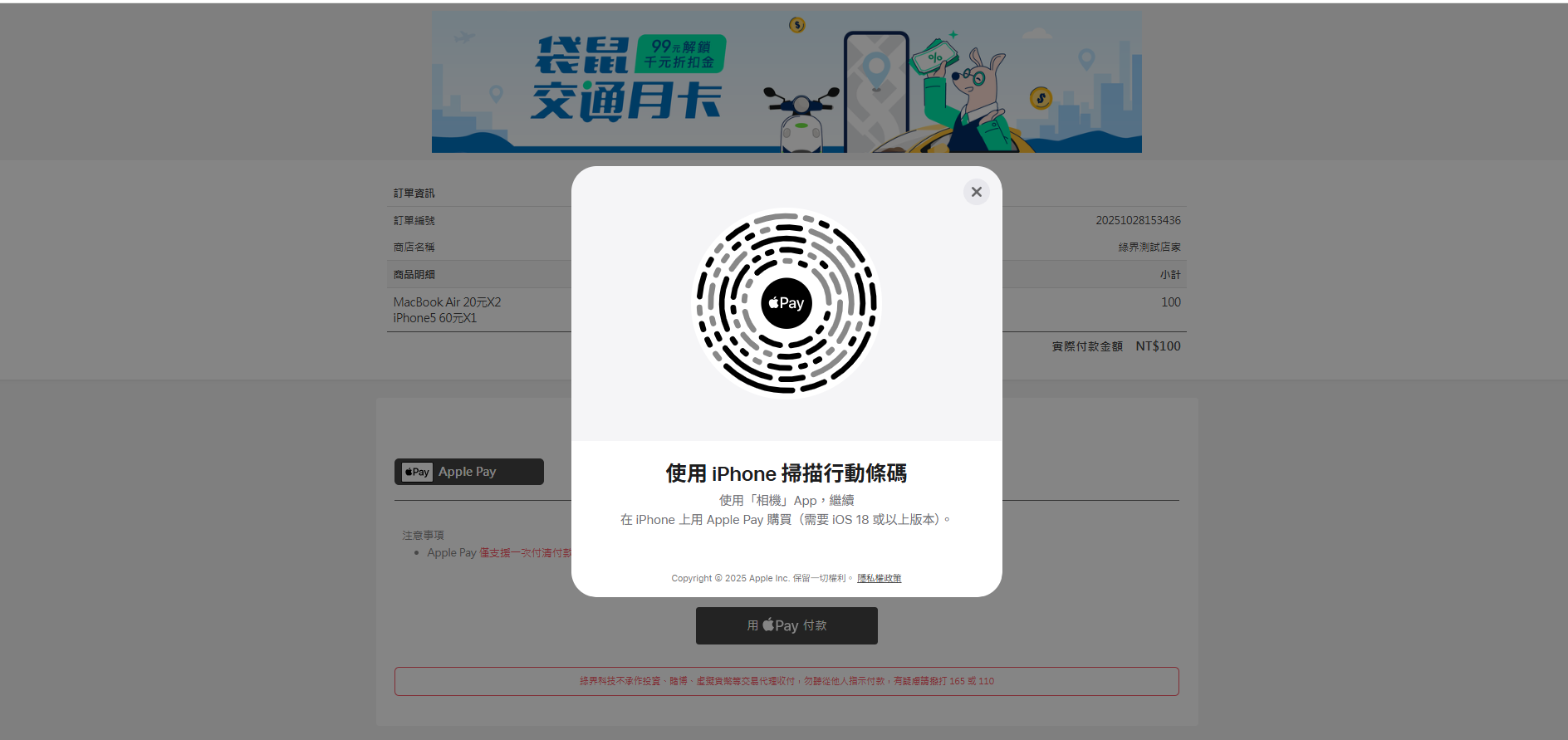 - 當瀏覽器不為Safari時,不會顯示Apple Pay付款功能。